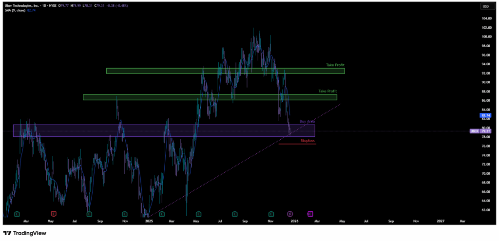 Uber saat ini berada di zona teknikal krusial $78–80, yang secara historis dan struktural berpotensi menjadi titik pantulan kuat. Dengan dukungan sentimen analis yang masih positif dan struktur uptrend yang belum rusak, peluang rebound menuju $88 hingga $94 cukup terbuka, menawarkan potensi keuntungan +15–20% untuk swing trader.