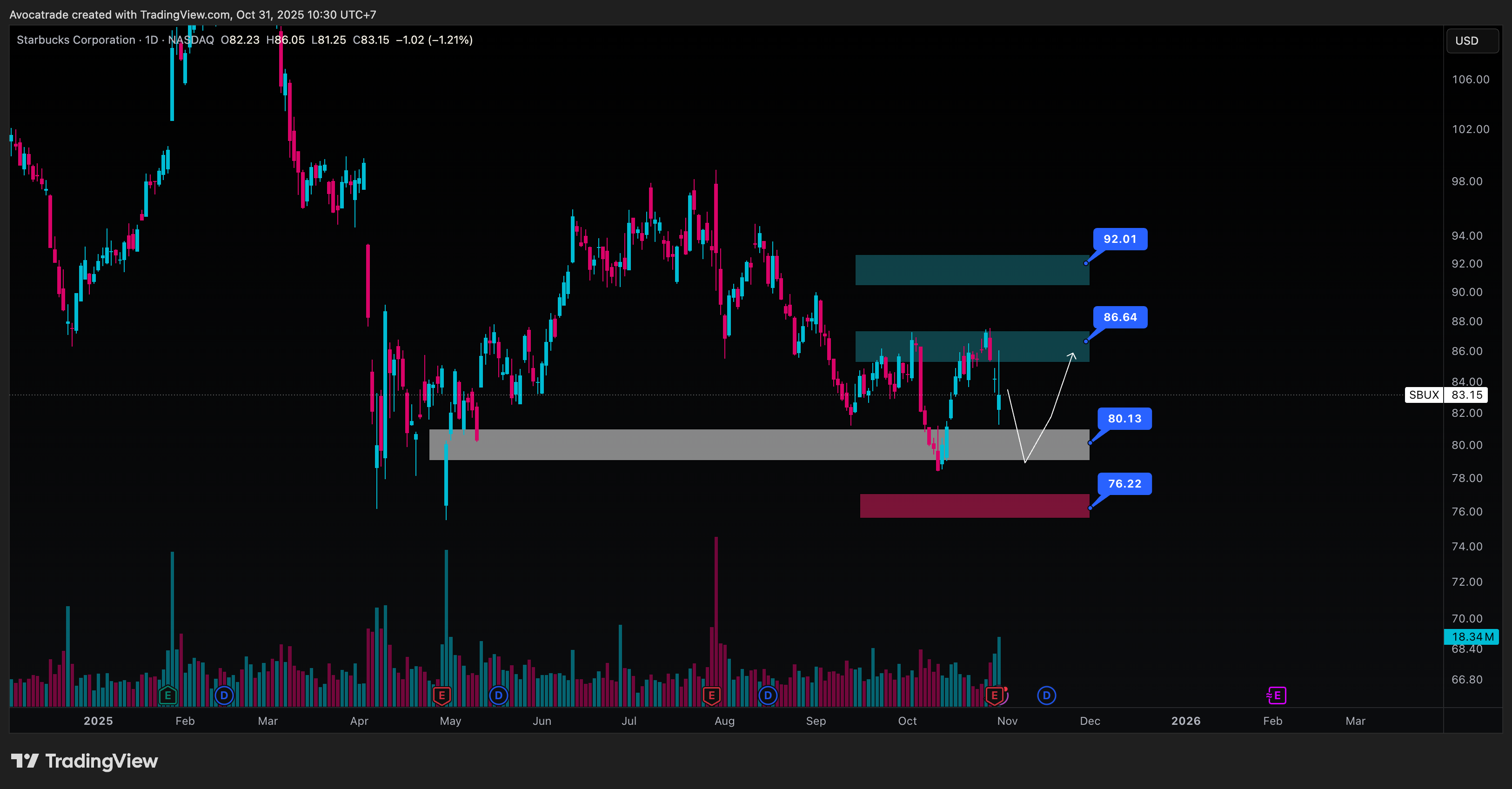 Secara teknikal, saham SBUX masih bergerak dalam tren turun jangka menengah, namun mulai membentuk struktur higher low di sekitar area $80 yang berfungsi sebagai zona demand kuat. Kenaikan volume di area ini menunjukkan potensi akumulasi investor jangka menengah. Jika harga berhasil menembus resistance minor di $86.6, momentum bullish jangka pendek dapat mengarah ke target utama $92, membuka ruang upside sekitar 15% dari posisi saat ini. Namun, jika breakdown terjadi di bawah $76, tren bearish kemungkinan berlanjut menuju area $72.