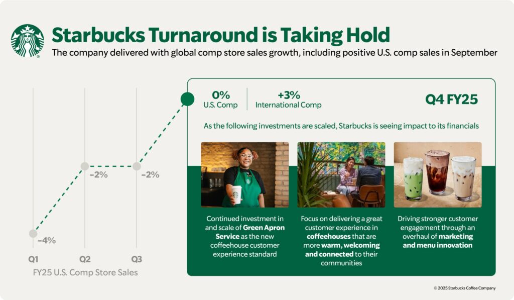 Starbucks mencatat pertumbuhan same-store sales global +1%, melampaui ekspektasi pasar yang memperkirakan penurunan. Khusus di AS — pasar terbesar perusahaan — penjualan sempat flat selama kuartal, tetapi mulai positif di bulan September dan berlanjut hingga Oktober. Hal ini menunjukkan bahwa strategi turnaround mulai membuahkan hasil.