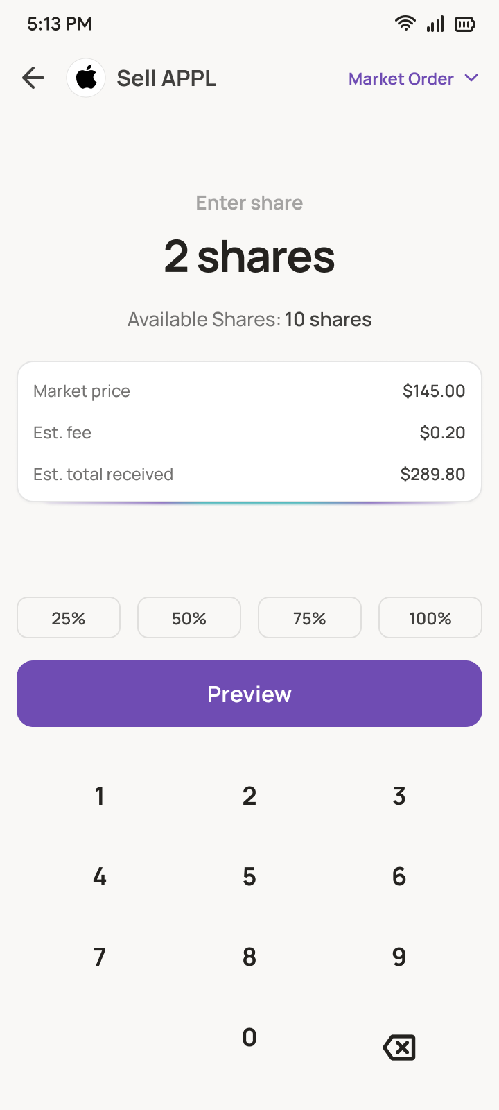 - Kemudian masukan nominal jumlah dan harga US Stock yang ingin ditransaksikan atau kamu dapat menggunakan tombol persen (25% , 50% , 75% , 100%) dari saldo wallet yang akan dipakai untuk menjual.