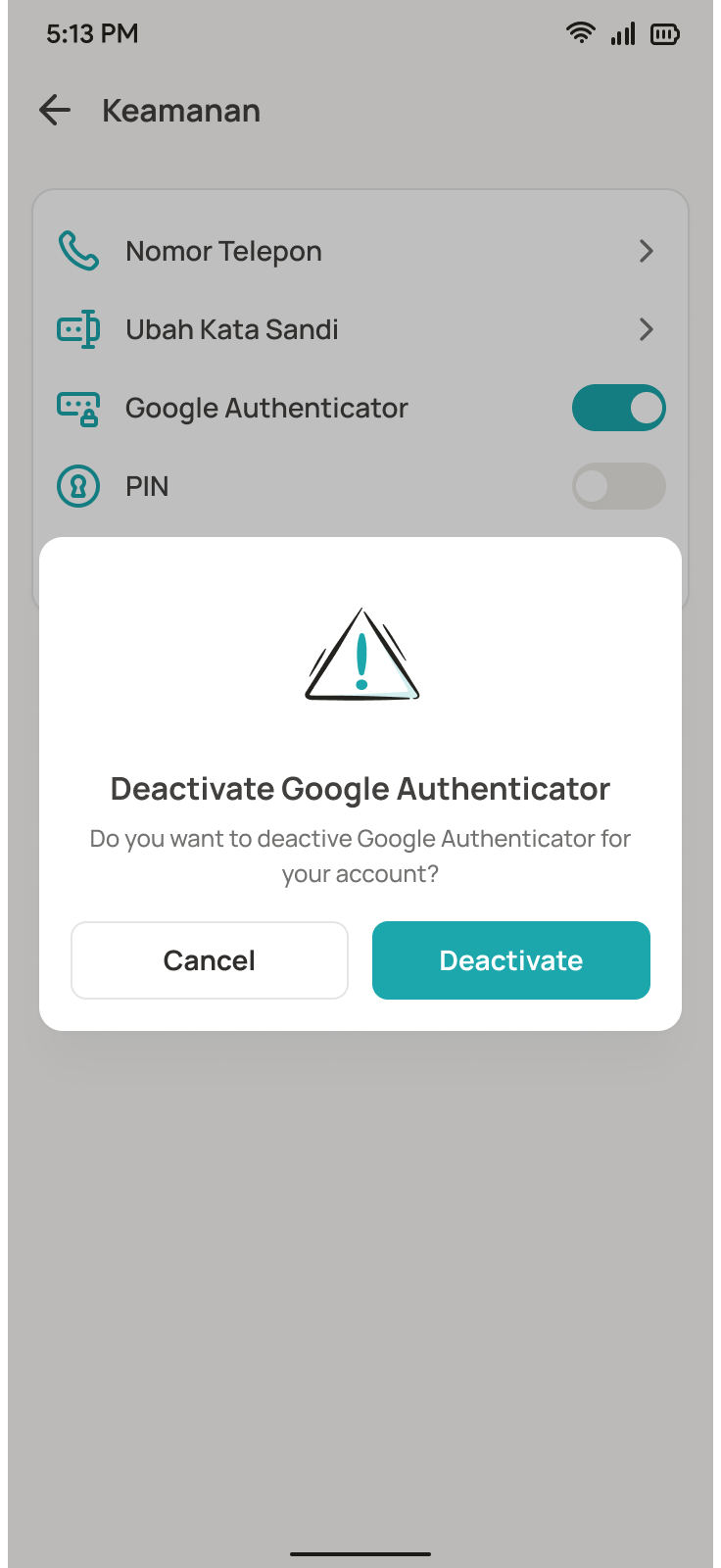 - Klik “Deactivate”, setelah itu masukkan kode yang dikirimkan ke aplikasi Google Authenticator milik kamu.