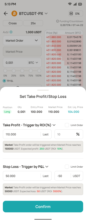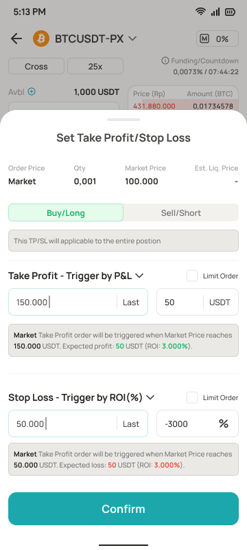 - Tentukan harga jual otomatis saat keuntungan mencapai targetmu. Dan Tentukan harga jual otomatis untuk membatasi kerugian jika harga turun. Pastikan Kamu sudah mengatur trigger dengan benar. Jika sudah sesuai, klik “Confirm” untuk menyetujui transaksi.