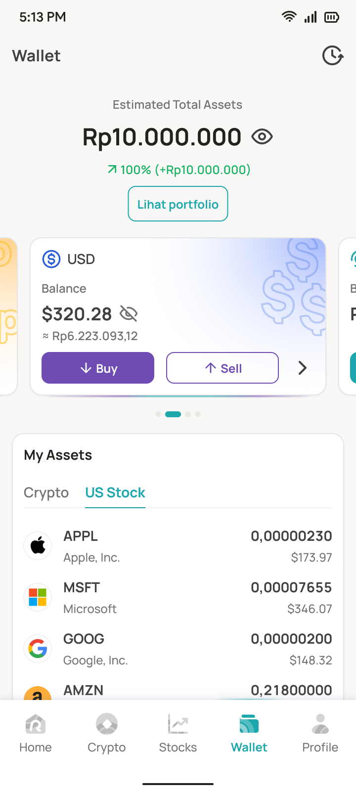 - Geser ke kiri pada moving banner di bawah tombol Lihat Portofolio untuk melihat wallet USD, lalu klik beli.