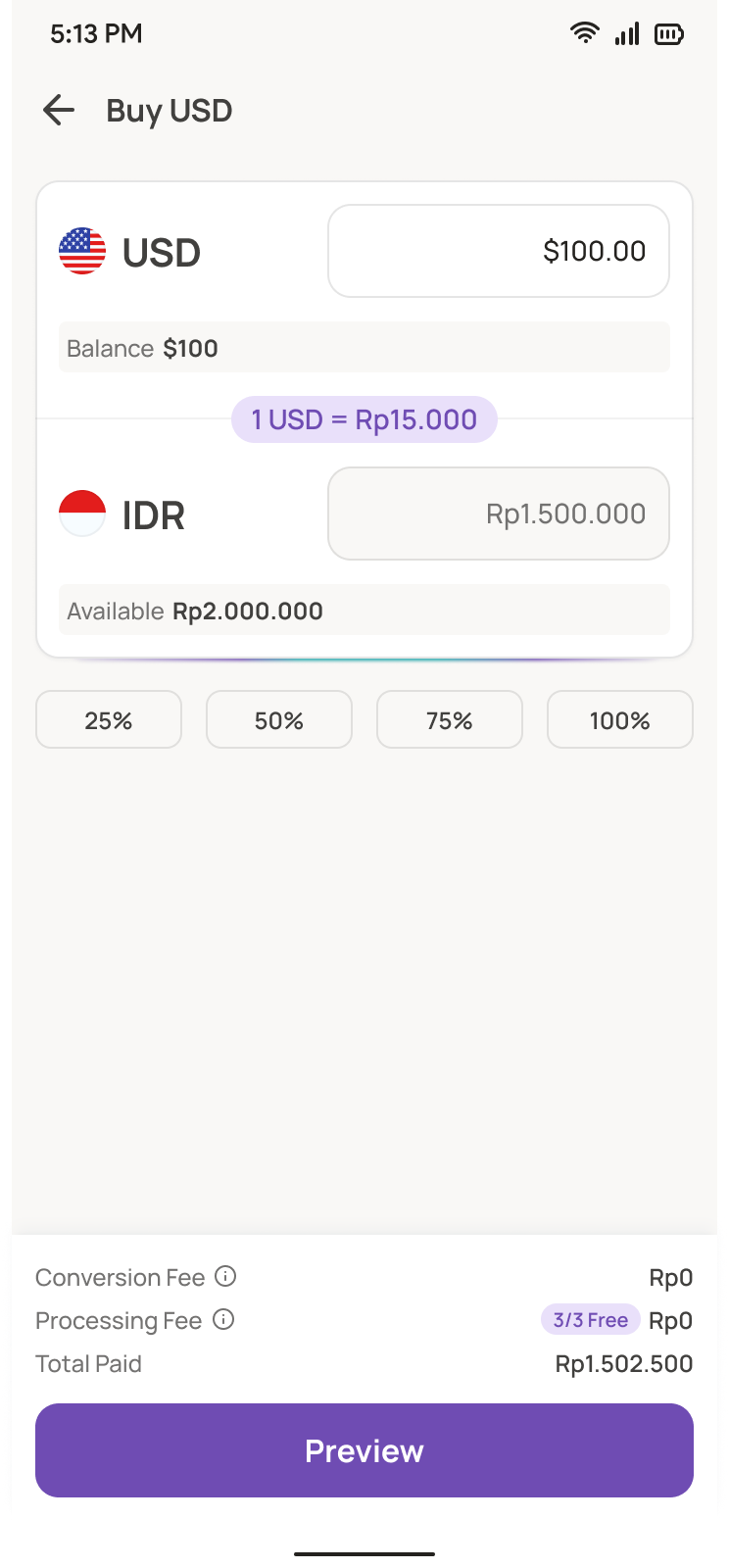 - Kemudian masukan nominal jumlah dan harga USD yang ingin ditransaksikan atau kamu dapat menggunakan tombol persen (25% , 50% , 75% , 100%) untuk menentukan berapa persen dari saldo wallet IDR yang akan dipakai untuk membeli USD. Setelah itu, kamu bisa mengklik tombol preview.