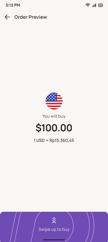 - Setelah memilih tombol preview, maka kamu akan diarahkan ke halaman yang memperlihatkan Jumlah USD, dan nominal IDR yang akan di transaksikan. Apabila sudah sesuai dengan yang kamu inginkan, kamu bisa melakukan Swipe Up untuk menyelesaikan transaksi beli USD.
