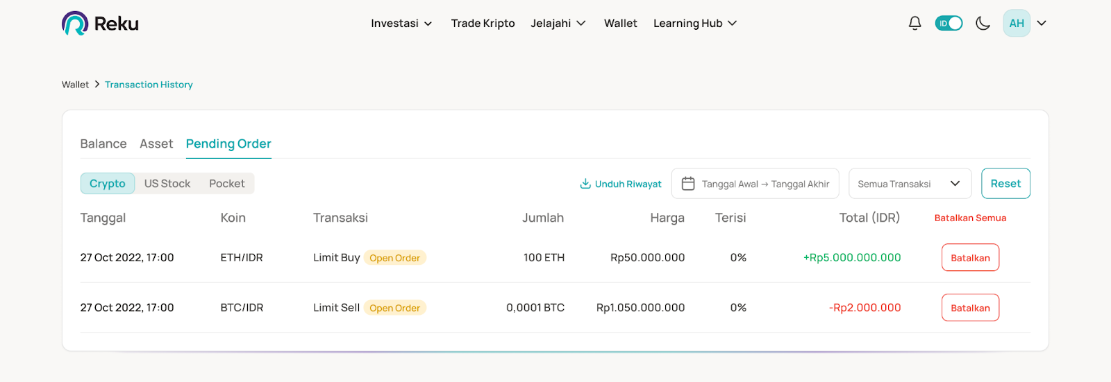 Open Order dapat kamu lihat pada Menu “Wallet”, pilih Pending Order kamu lalu pada bagian bawah dapat kamu lihat kolom berisikan informasi tentang daftar transaksi Open Order.