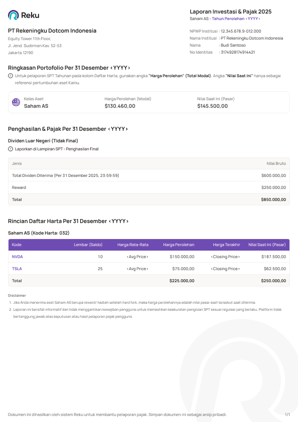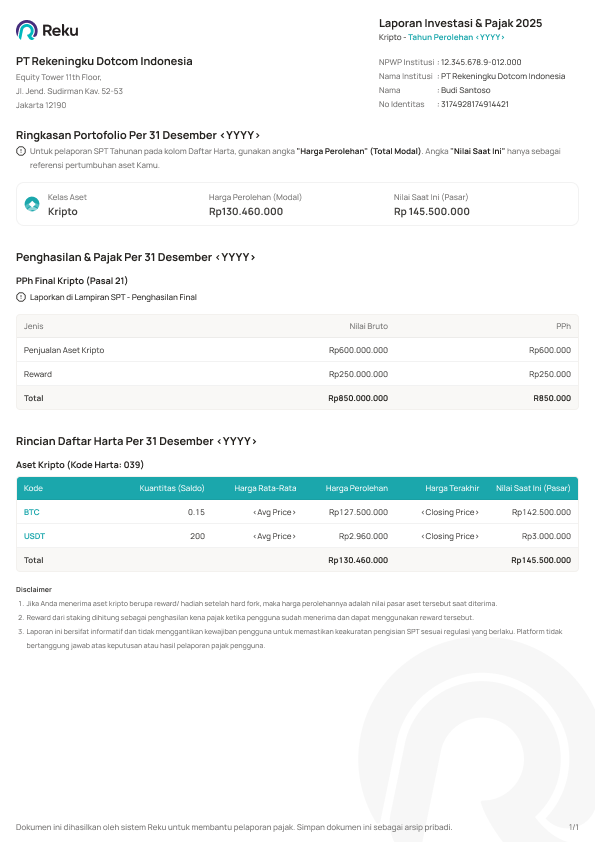 Oleh karena itu Reku menghadirkan fitur Laporan Pajak Aset yang mencakup transaksi aset kripto dan US stocks. Melalui fitur ini, setiap transaksi pembelian dan penjualan yang dilakukan di platform Reku akan terdokumentasi secara rapi untuk mendukung kebutuhan pelaporan pajak pengguna.